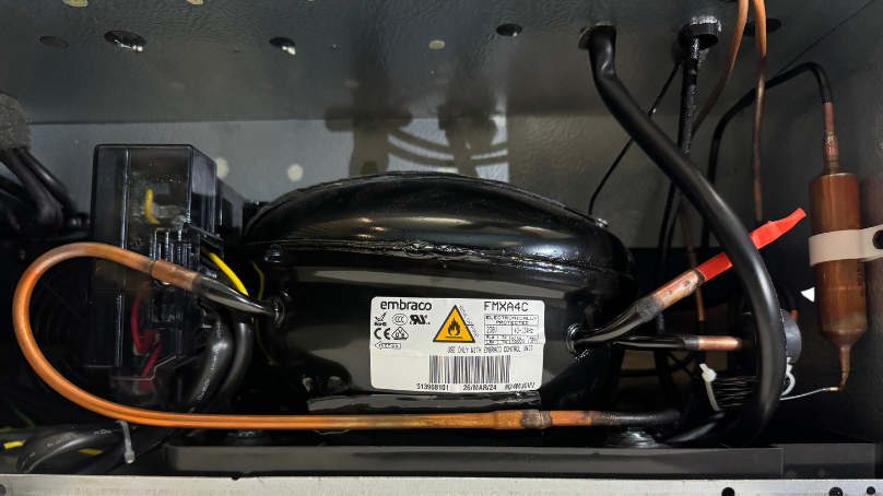 De compressor is gemonteerd op rubberen bussen om trillingen te absorberen en de planken zijn gemaakt van massief beukenhout om interne trillingen te absorberen.