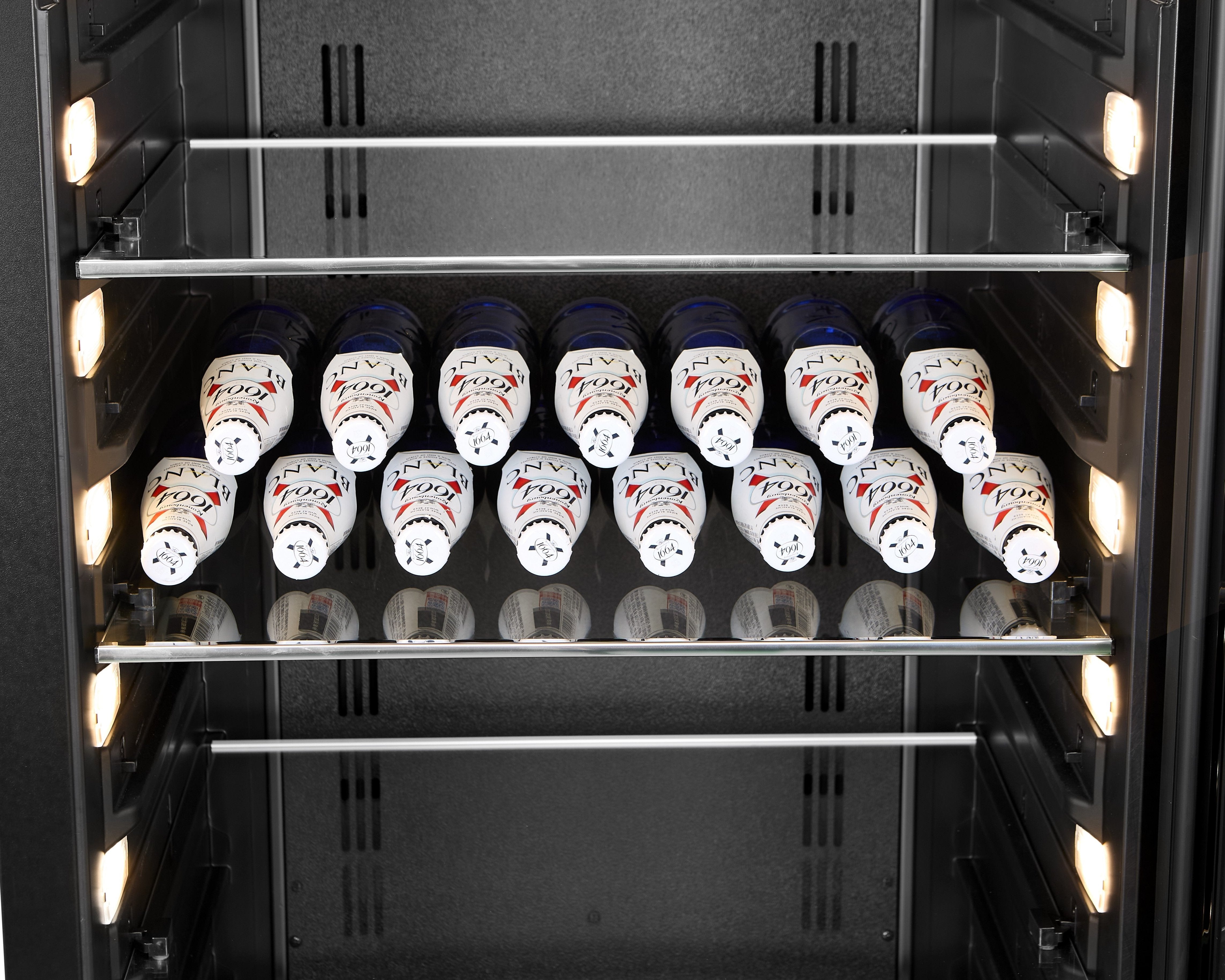 De wijnzijde van de combinatie biedt gemakkelijke toegang tot de flessen met uitschuifbare telescopische rails die tot 80% uitschuifbaar zijn. De flessen staan nek aan nek om de maximale opslagcapaciteit te bereiken en zijn geschikt voor zowel Bordeaux- als Bourgogneflessen.